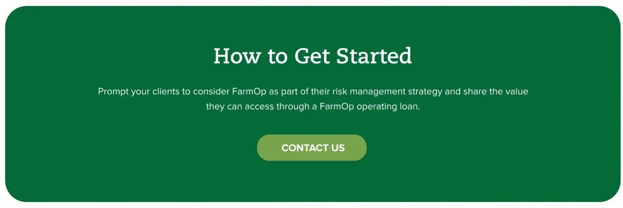 You already help farmers manage risk through crop insurance. FarmOp Capital fits naturally into that conversation by providing operating loans built around future crop production, crop insurance and disciplined commodity marketing, not land ownership. It’s financing designed to work with the risk management strategies your clients already trust.