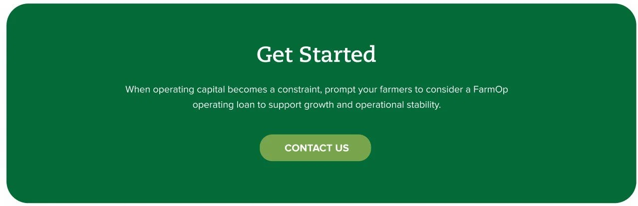 As a farm manager, you know your farmers’ financial situation better than anyone. You see opportunities — and challenges — in their cash flow, operating capital and growth plans. FarmOp Capital is designed to complement your insights with flexible financing solutions.